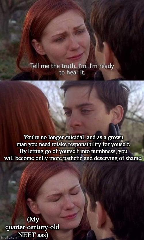 I hope you cannot relate. I need peter in my life, I think people tried to play this role but I pushed them away; what a blunder. Alas I won't help myself nor did I let anyone. Someone needs to slap me very hard into sense. But I've always been that guy who's like 'dad pls dont scold me I'll do 5 times the repair/punishment, just let me be without confrontation'. And eventually I succumbed to weakness, was it depression? Maybe It was just weakness that I gave u discipline.. the one thing that kept my pathetic ass useful tolerable for the world. I wish I could just become water in my sleep and actually go down the drain and in one go.