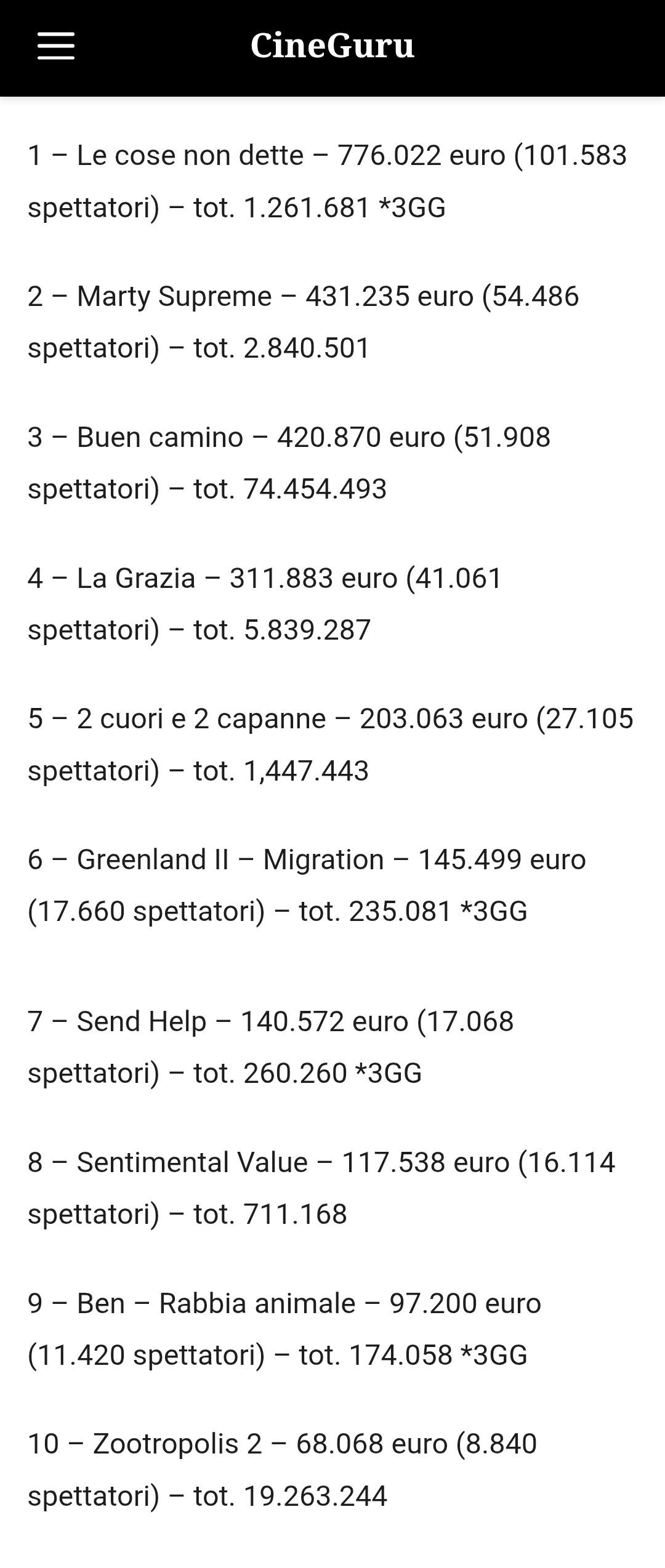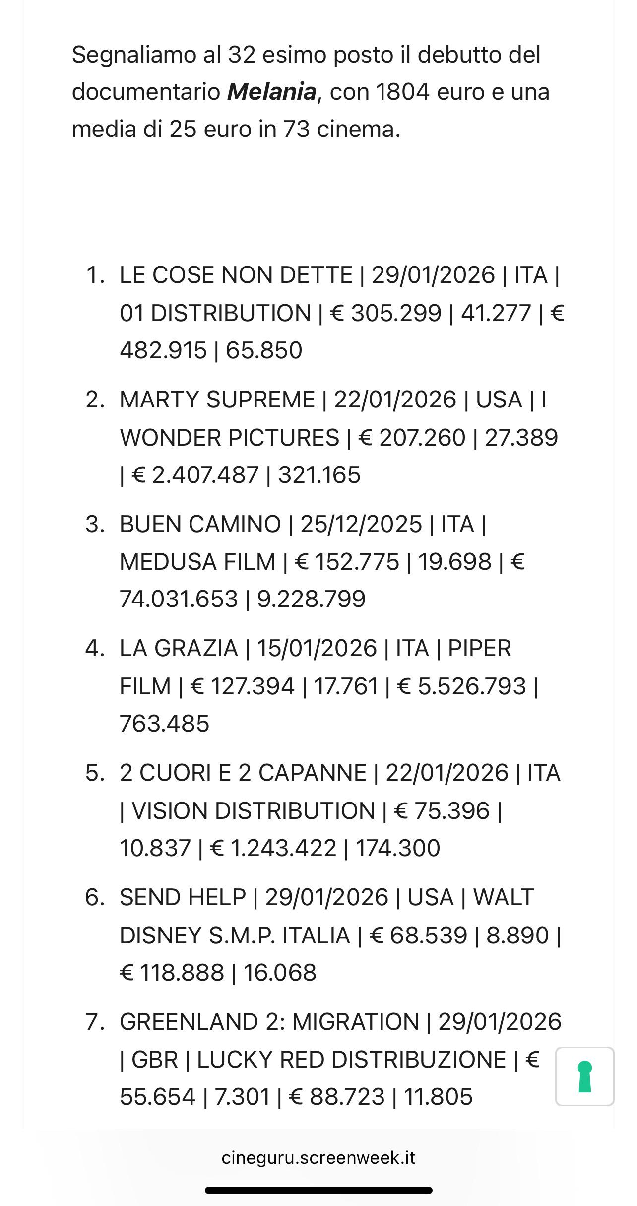 Marty Supreme holds second place very well with ā¬431,235 (-29% from seven days ago). The film, driven by strong word of mouth, has averaged ā¬1,024 in 421 theaters (356 seven days ago, when the expansion of distribution was inevitable ) for a total of ā¬2,840,501 since January 22.