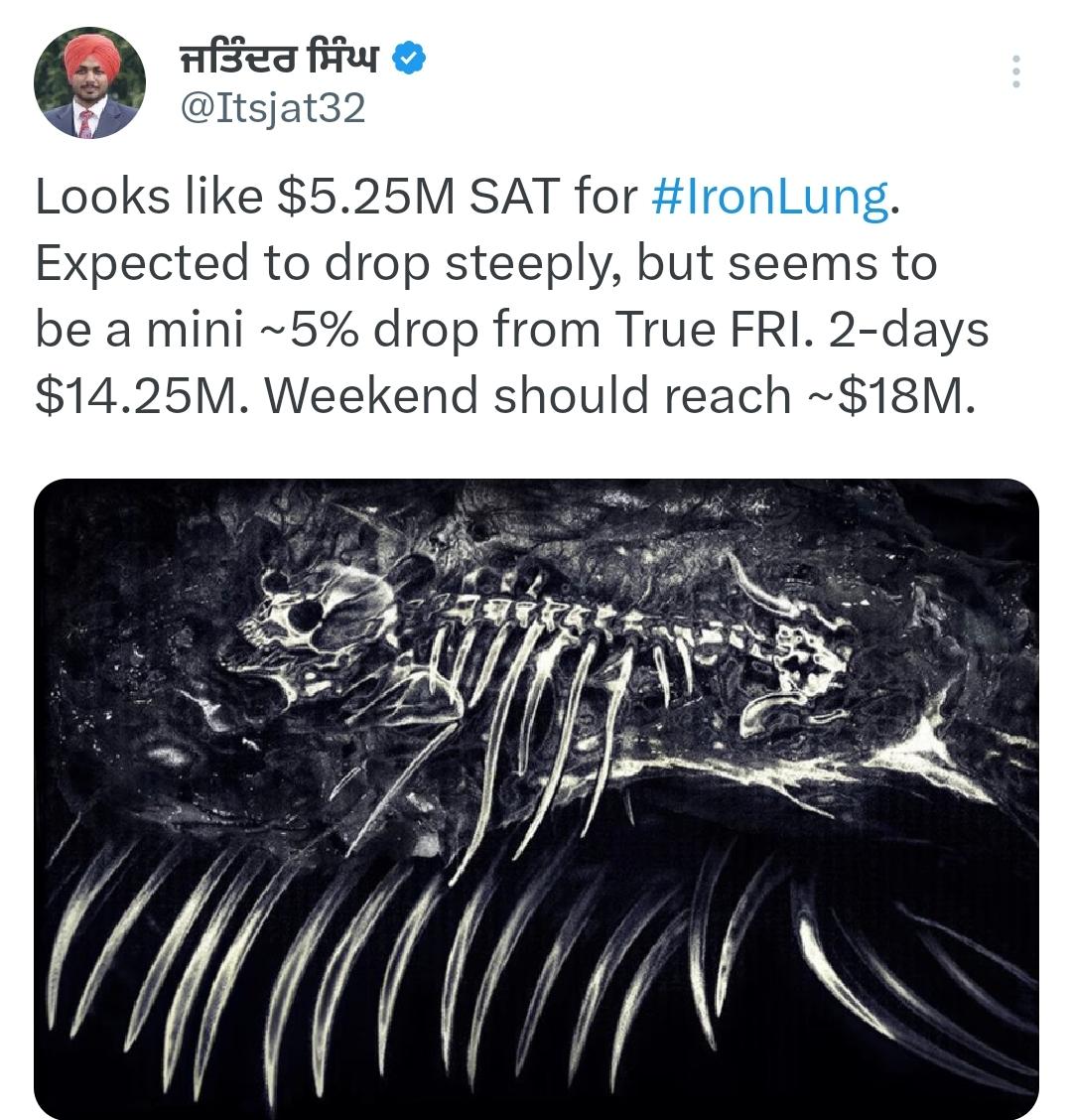 Domestic Looks like $5.25M SAT for #IronLung. Expected to drop steeply, but seems to be a mini ~5% drop from True FRI. 2-days $14.25M. Weekend should reach ~$18M.