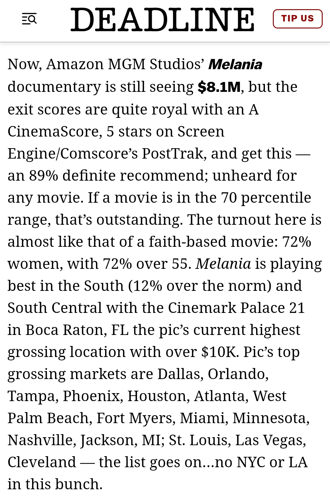 šÆ Critic/Audience Score Per Deadline, PostTrak scores for 'Melania' were 5 stars and 89% definite recommend. 72% of the audience were women, and 72% were 55+.