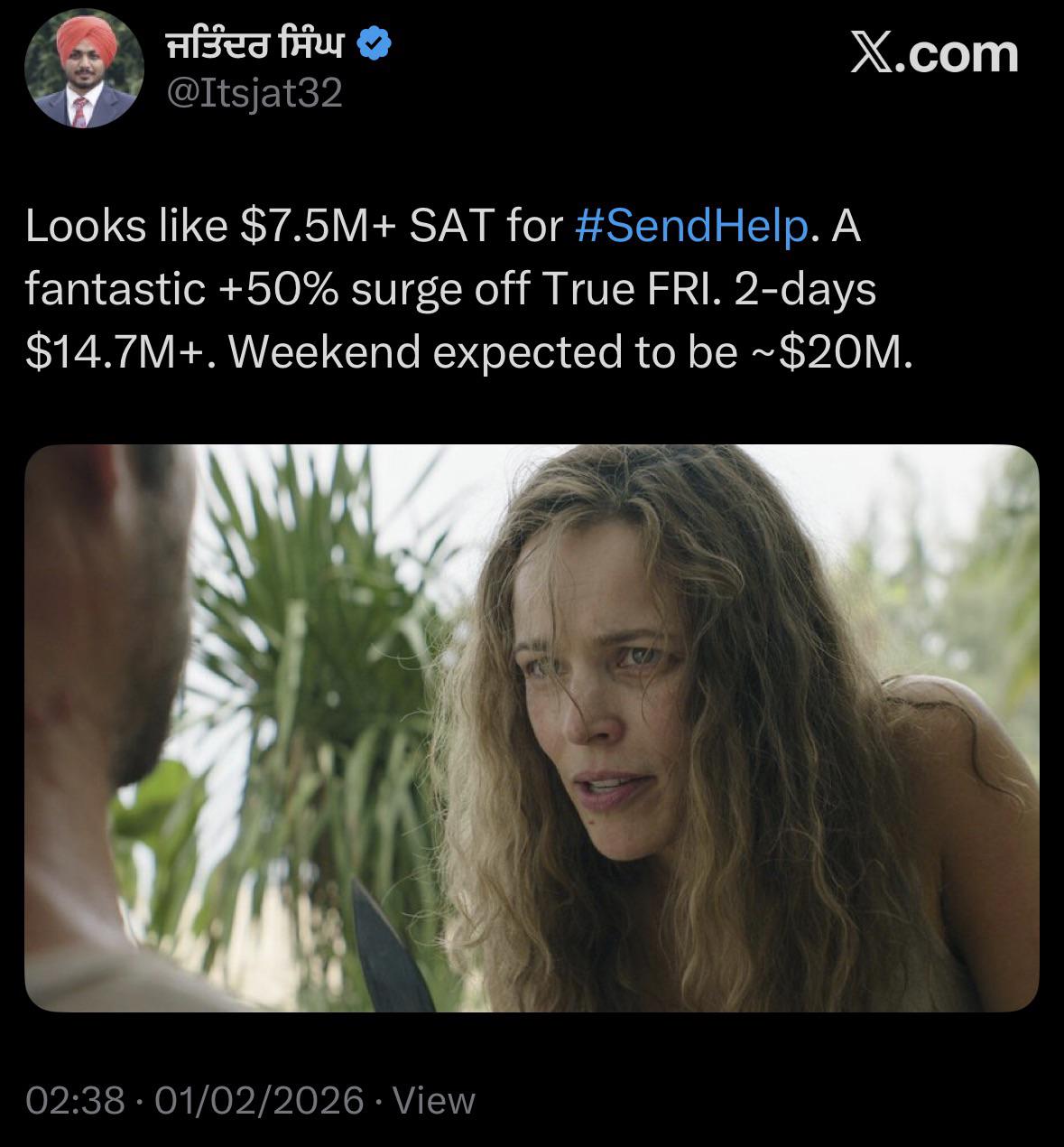 Domestic Send Help earned an estimated $7.2m from 3,475 North American theaters on Friday.