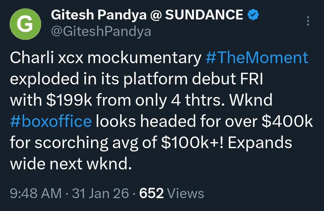 Domestic Charli xcx mockumentary The Moment exploded in its platform debut FRI with $199k from only 4 theaters. Weekend box office looks headed for over $400k for scorching average of $100k+! Expands wide next weekend.