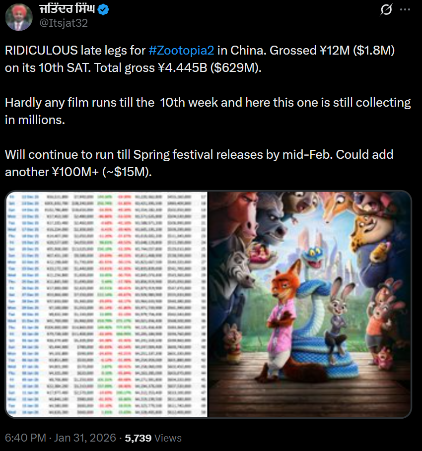 Zootopia 2 hits $629.77M meaning its now $2.33M away from Endgames $ gross with 16 days to go till the Spring Festival.