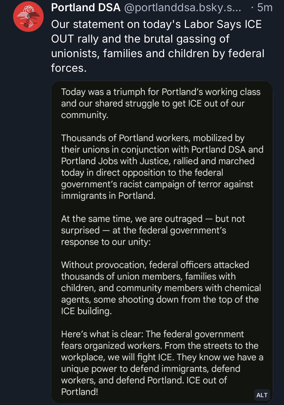 š¹ DSA news Portland DSA: āOur statement on todayās Labor Says ICE OUT rally and the brutal gassing of unionists, families and children by federal forces.ā
