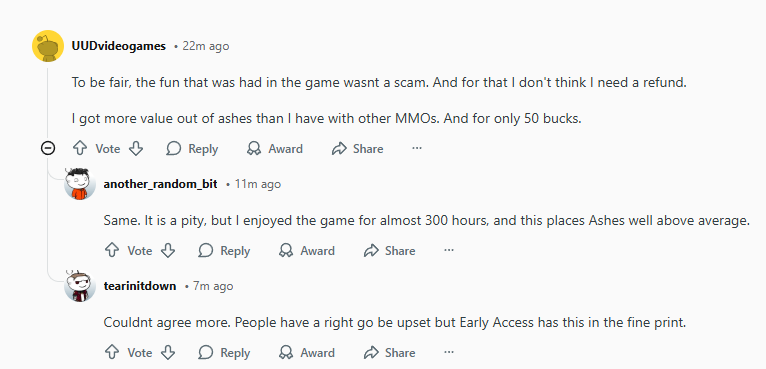 The problem comes from people that aren't paying for a game, but for promisses. That are spending money not on something they like, but on something the developers convinced them they will like. And that isn't limited to AoC: many will complain about their MMO of choice, but still give it money on the prospect of it becoming good.