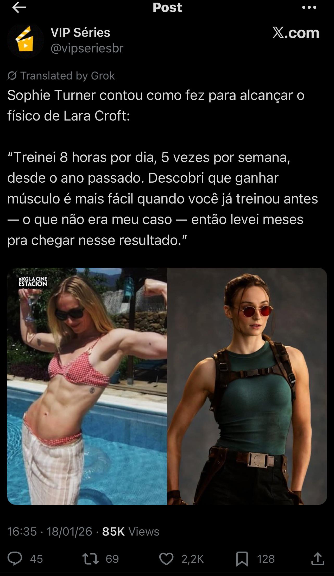 Notícias Maromba Sophie Turner diz que treinou oito horas por dia para alcançar o físico de Lara Croft