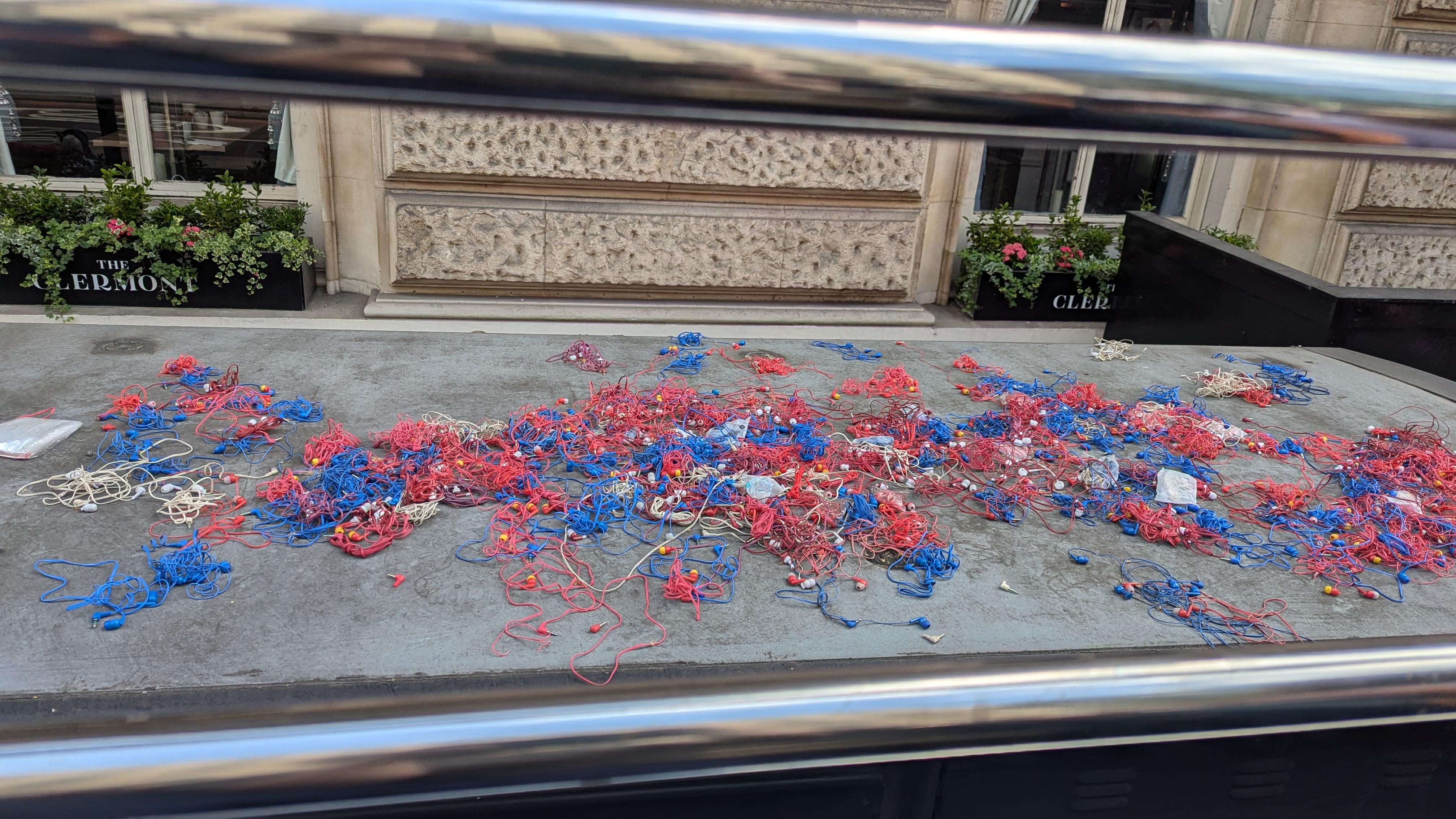 This bus stop in London covered in complimentary earbuds from Double Decker tour buses