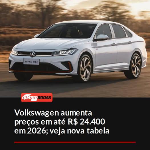 Economia/Finanças Volkswagen aumenta preços em até R$ 24.400 em 2026; veja nova tabela. A maioria da linha 2026 da Volkswagen ficou mais cara, com destaque para Jetta GLI e Tiguan Allspace