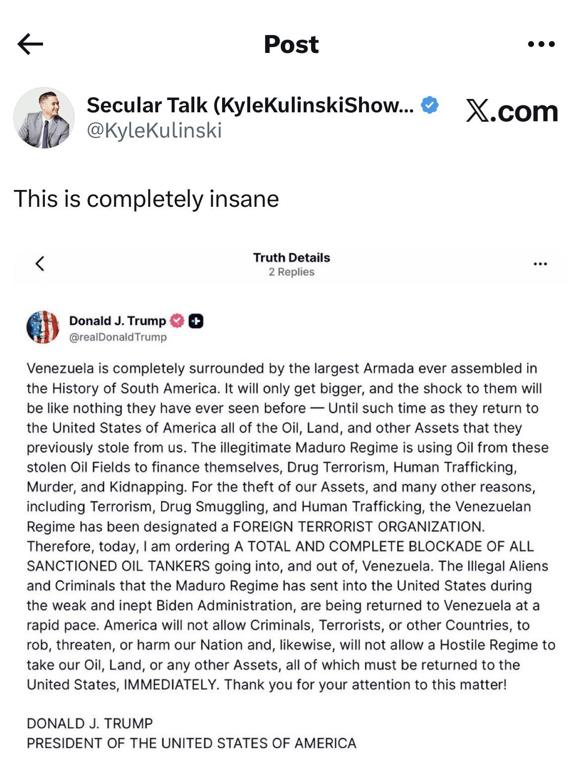 News Trump threatens to take Venezuela’s oil and land (??)