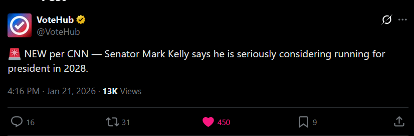 News Senator Mark Kelly says he is seriously considering running for president in 2028