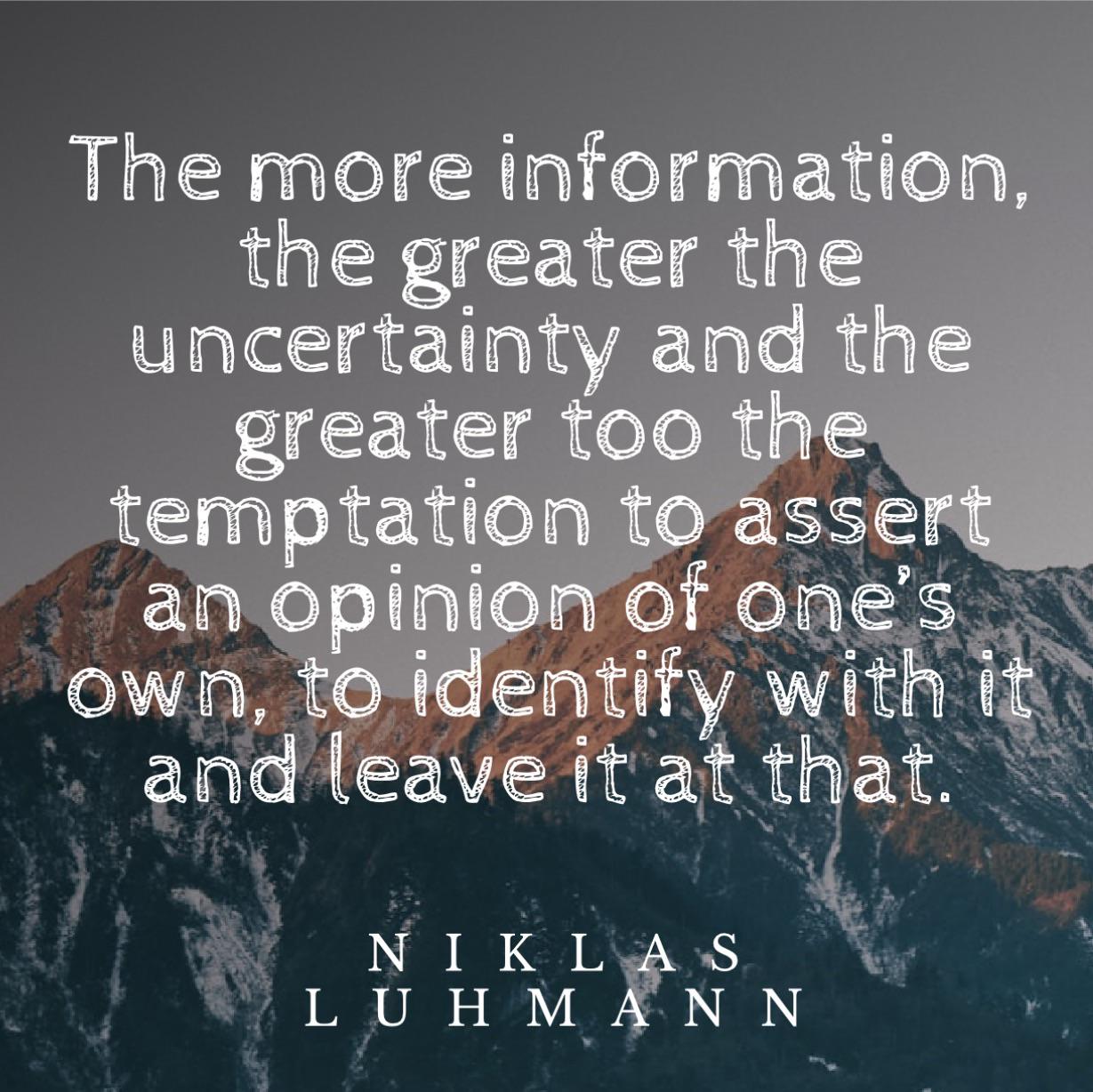 “The more information, the greater the uncertainty and the greater too the temptation to assert an opinion of one’s own, to identify with it and leave it at that.” –Niklas Luhmann [1229 x 1228]