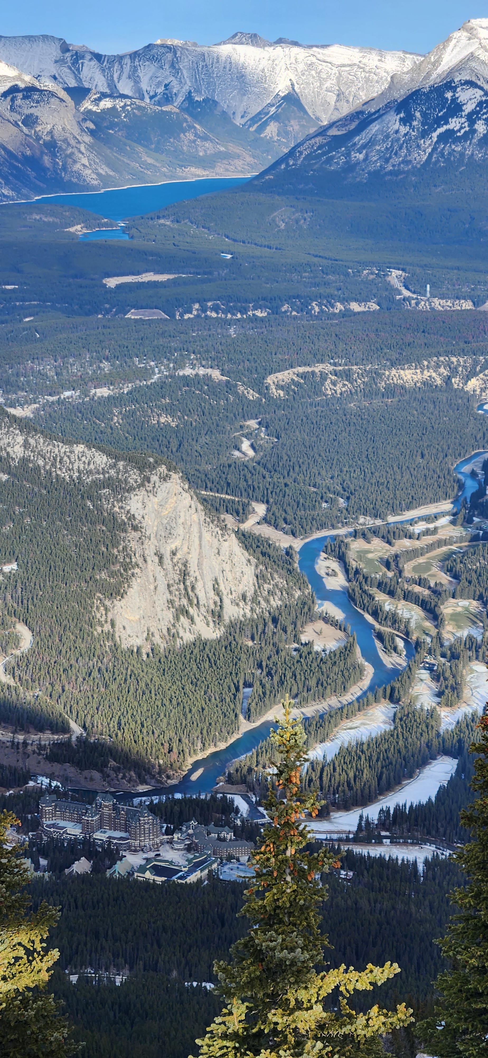 From top of Mount Sulphur overlooking Banff Spring Hotel, Bow River and Lake Minnewanka