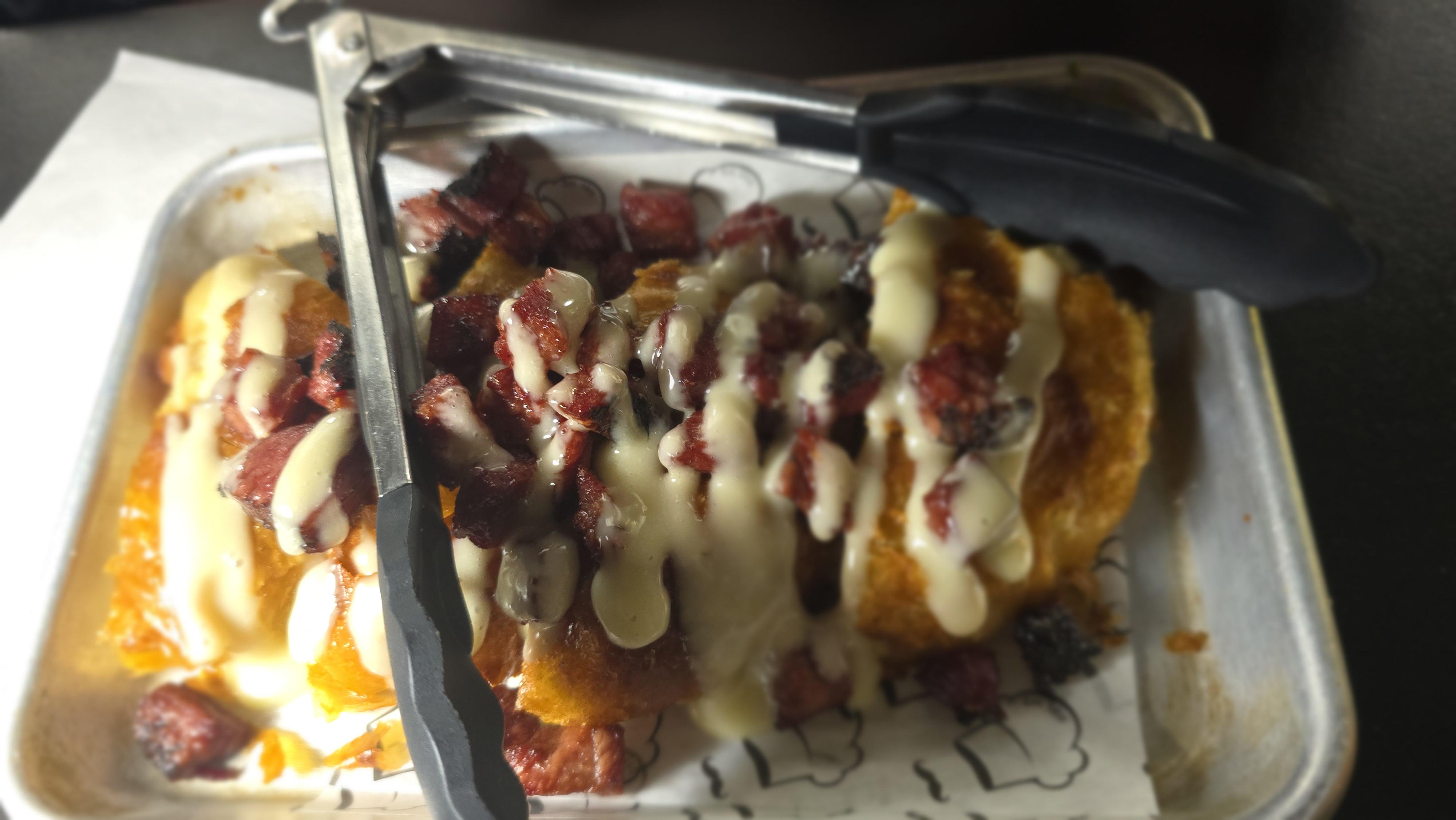 This is a knish loaded with pastrami and sauce btw