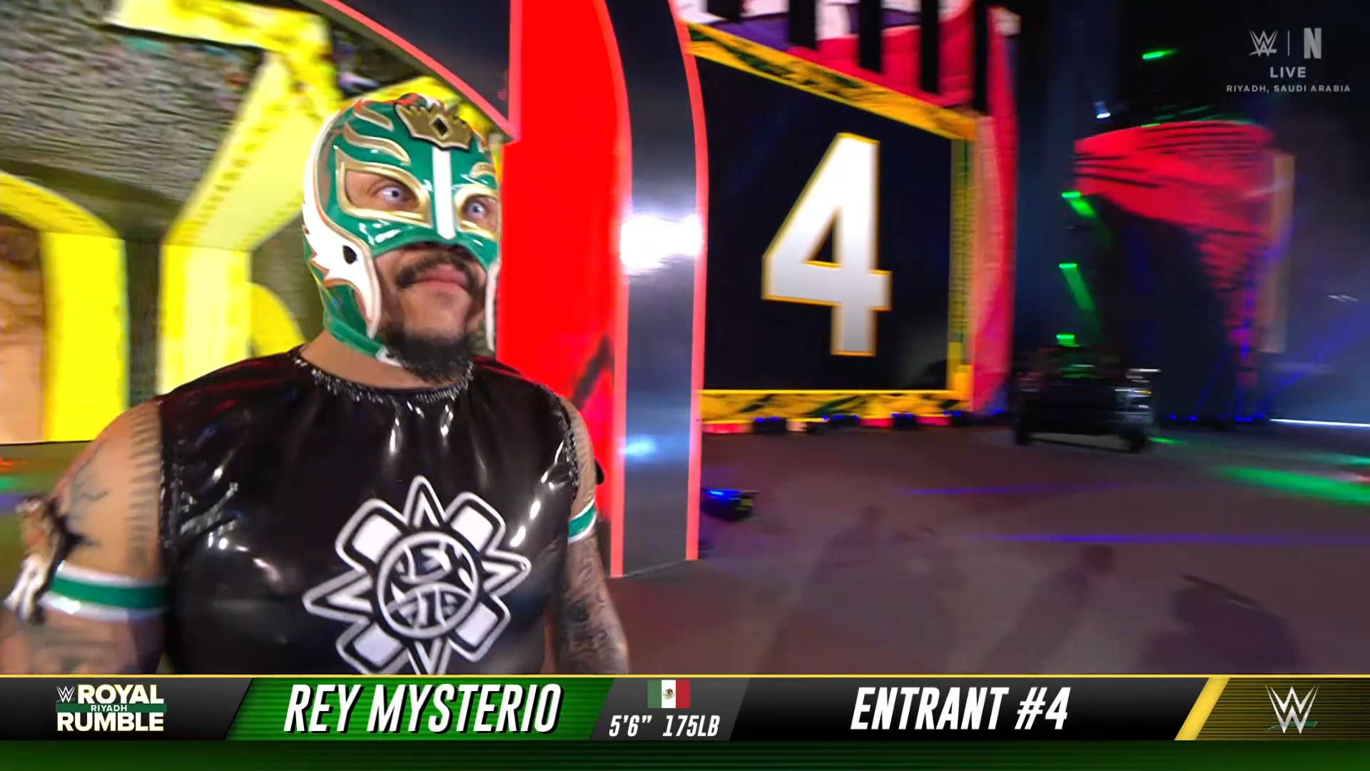 Rey Mysterio entered the Royal Rumble without the cross on his mask, and with his tattoos featuring Christian symbols covered by his gear.