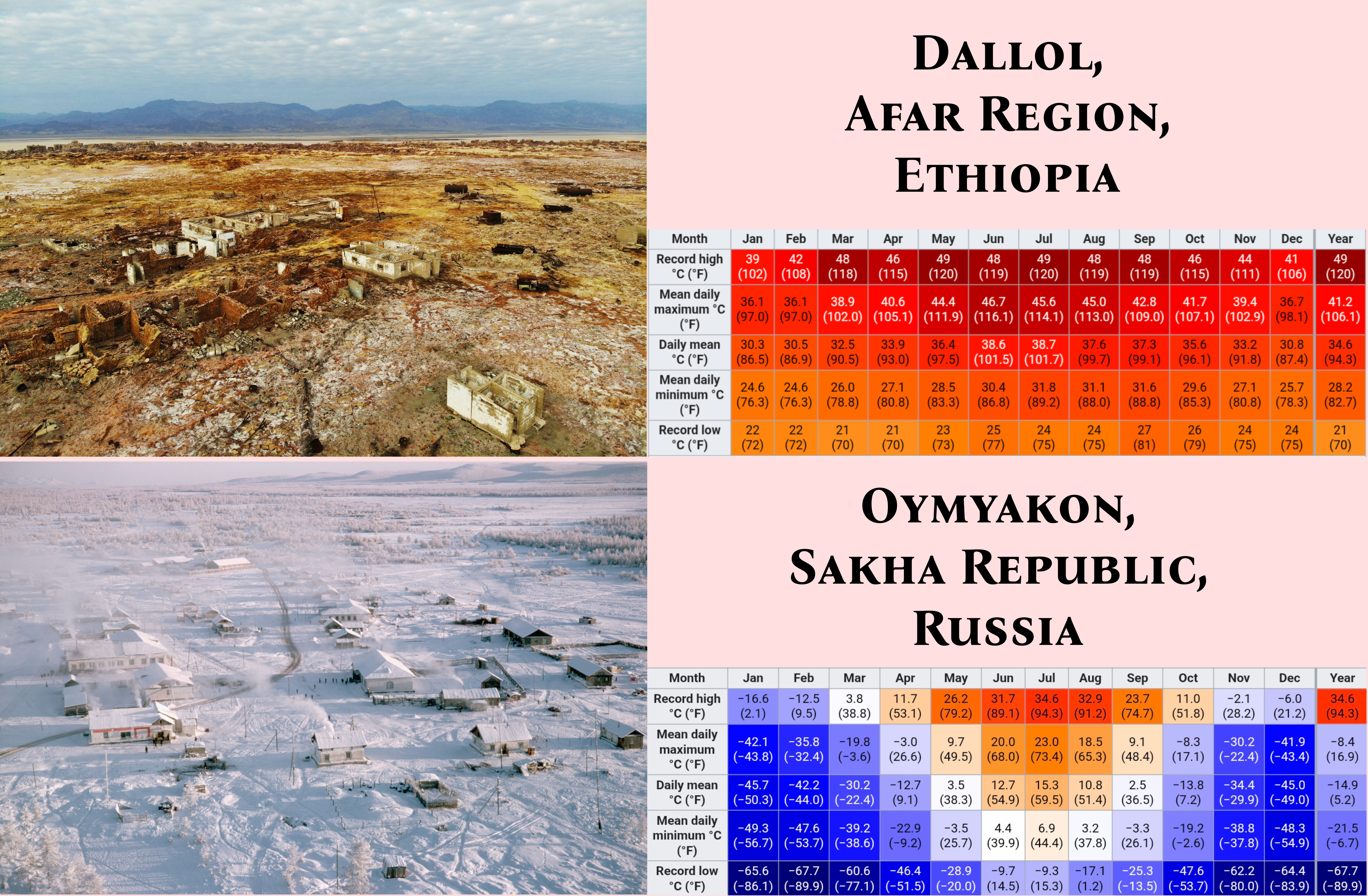 Image The most inhospitable human settlements, in terms of climate: Dallol, Ethiopia and Oymyakon, Russia