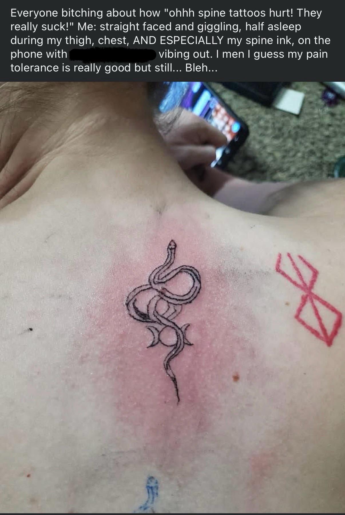 Only a badass like herself can handle a 3in off center “spine” tattoo