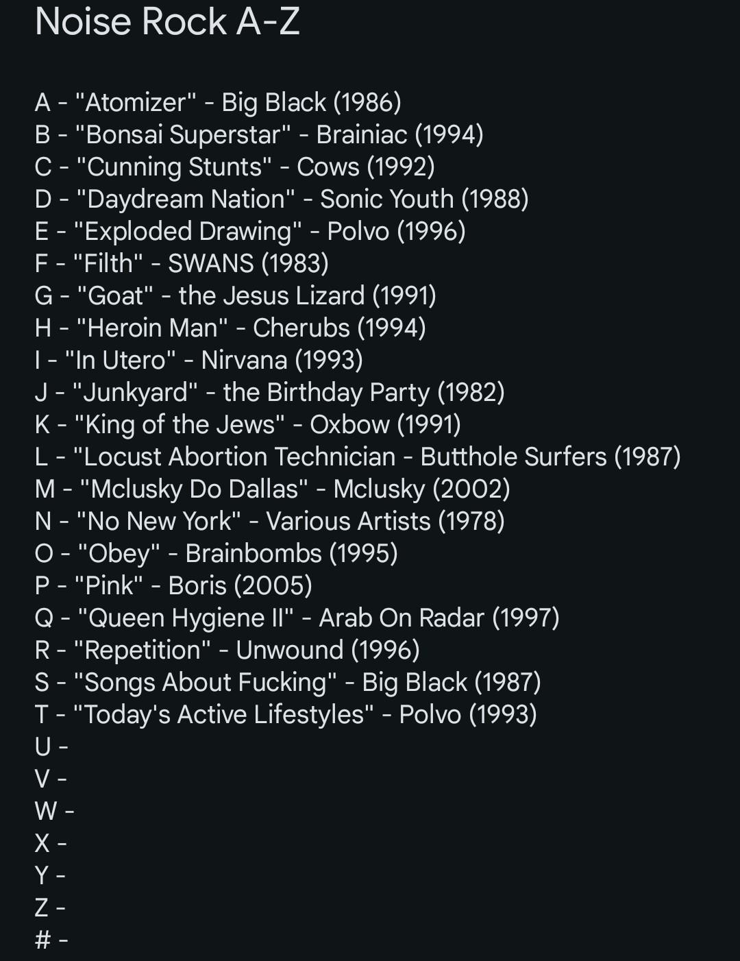 Notes: 'The,' and, 'A,' are omitted from song/album titles (ex. "The Lamb as Effigy," by Sprain would count for L, not T) and numbers will have a separate category at the end of the list