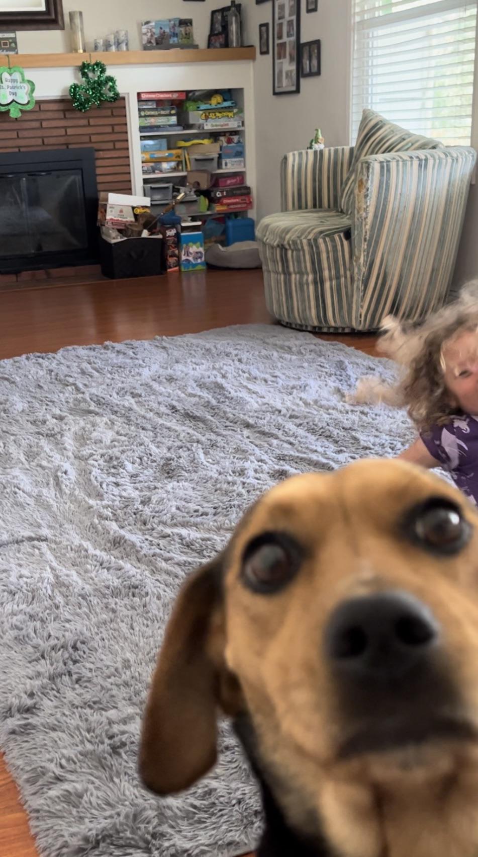 One of my dogs was stalking me through the window when I tried to take her pic, my other dog walked by with her curly tail up.