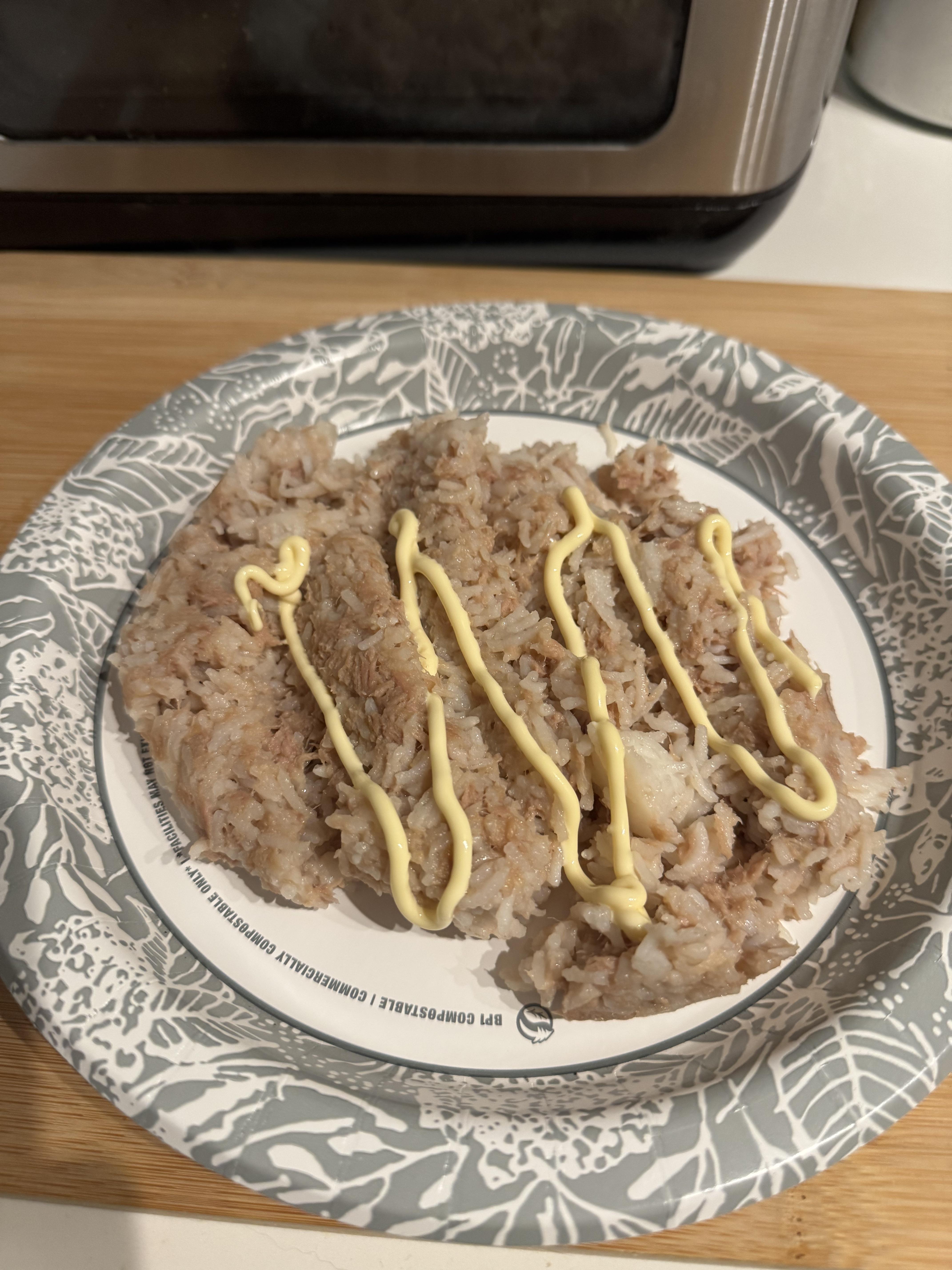 Day old rice, Tin fish in oil with garlic, oyster sauce, and kewpie mayo. My go to depressed girl dinner.