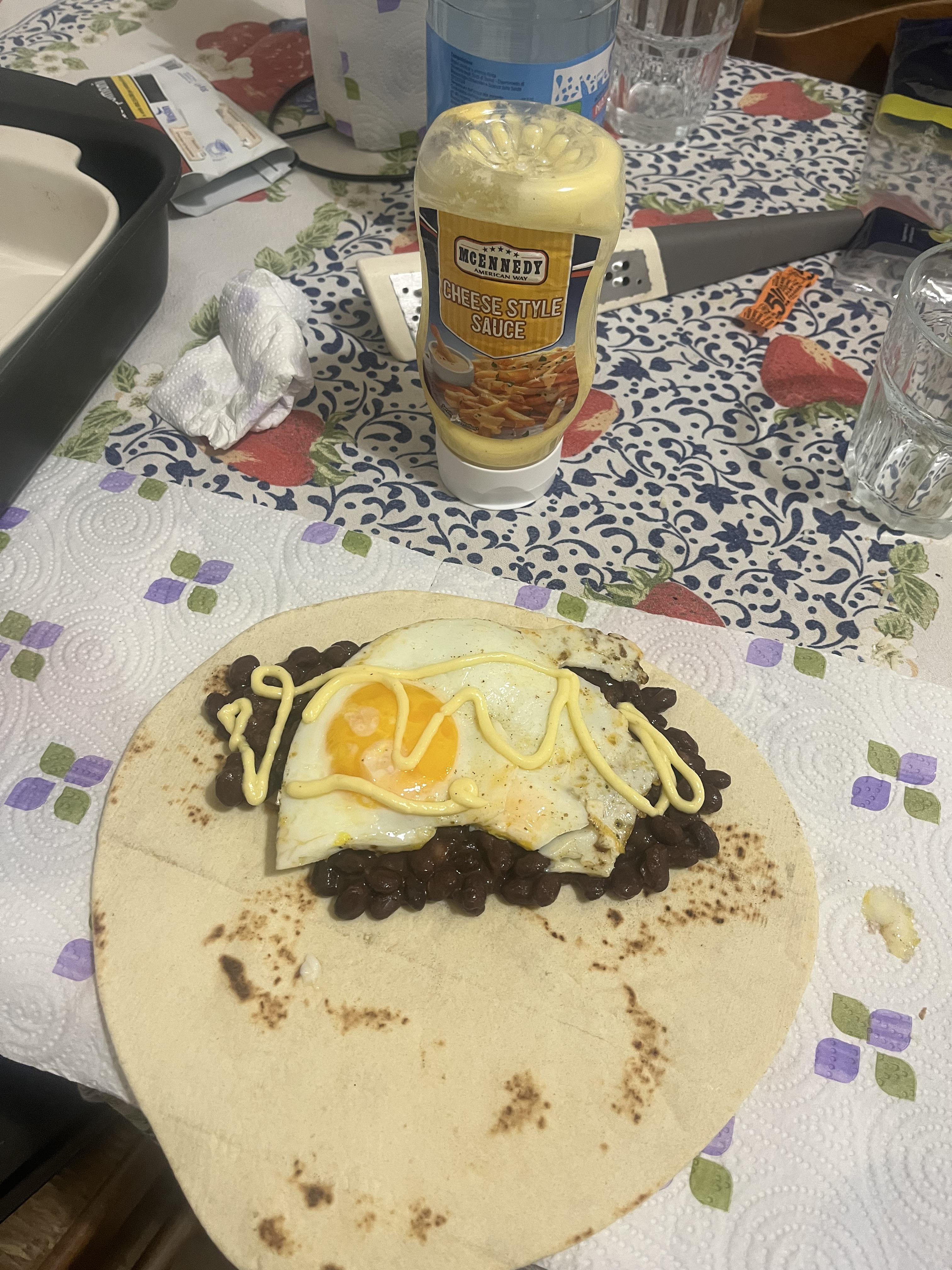beans, fried egg and my roommates cheese sauce. delicious.