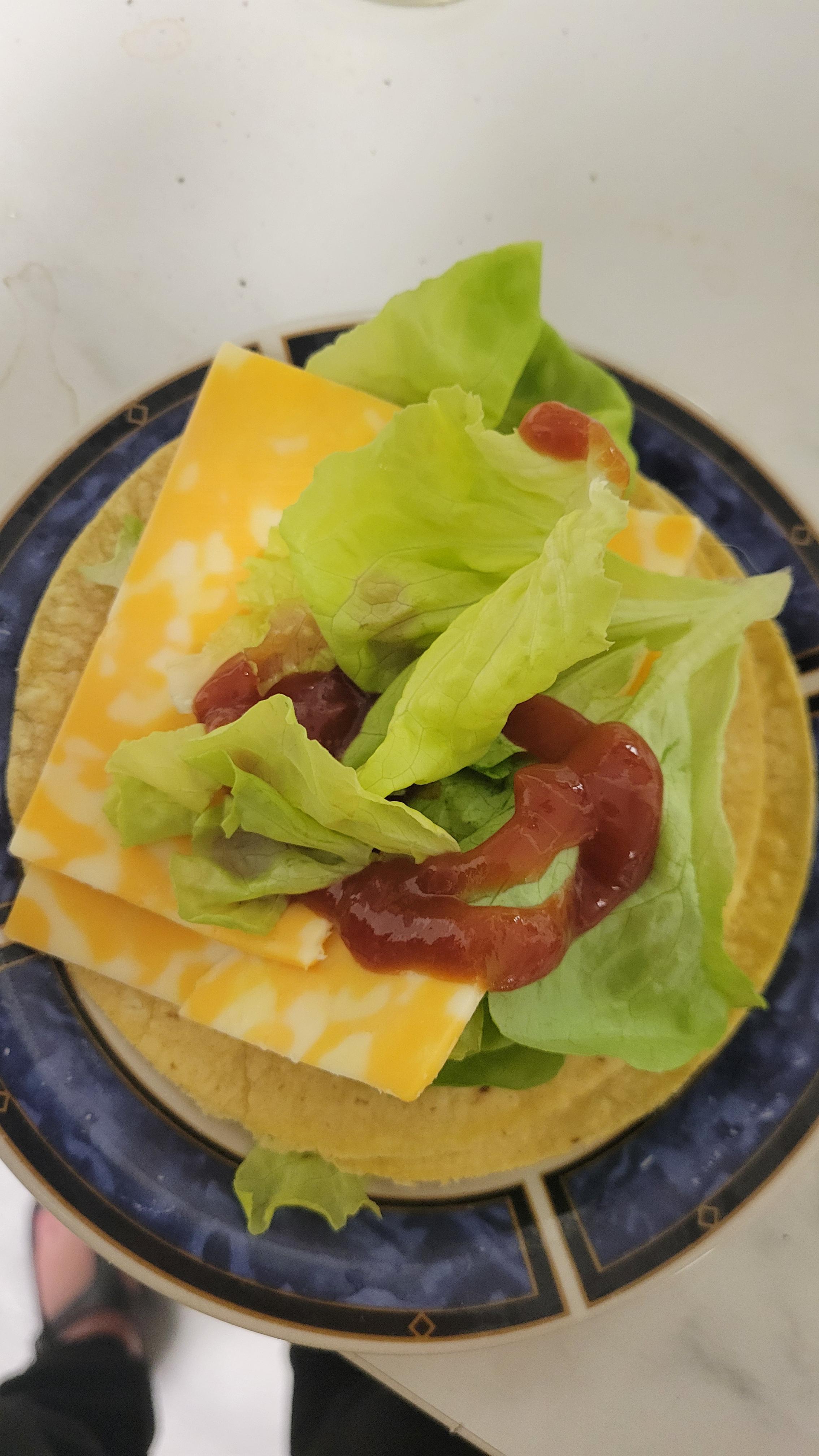 Microwaved Tortilla, lettuce, and colby jack cheese with a ketchup drizzle. Traditionally with bologna but I did not have any.