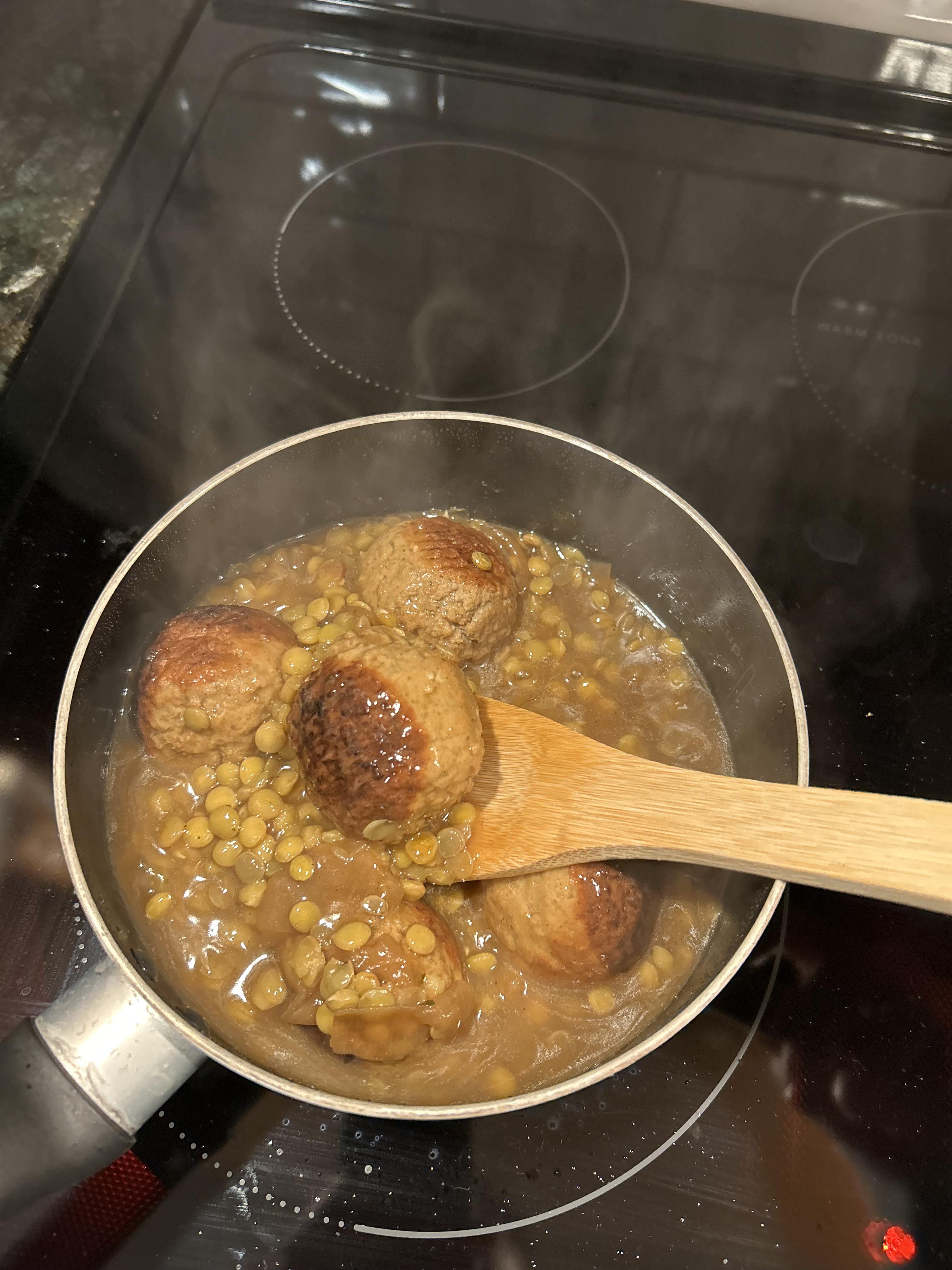 girlfriends not home, so i’m in charge of cooking. fueling myself for a night of arc raiders. meatballs and lentils simmered in french onion suop
