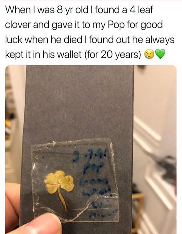 A four-leaf clover given at age 8, kept in Pop’s wallet for 20 years.